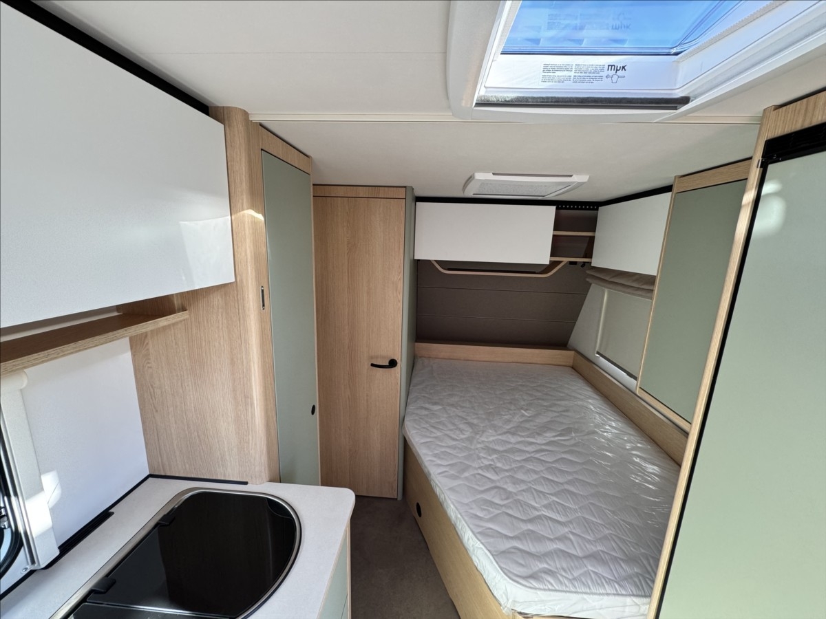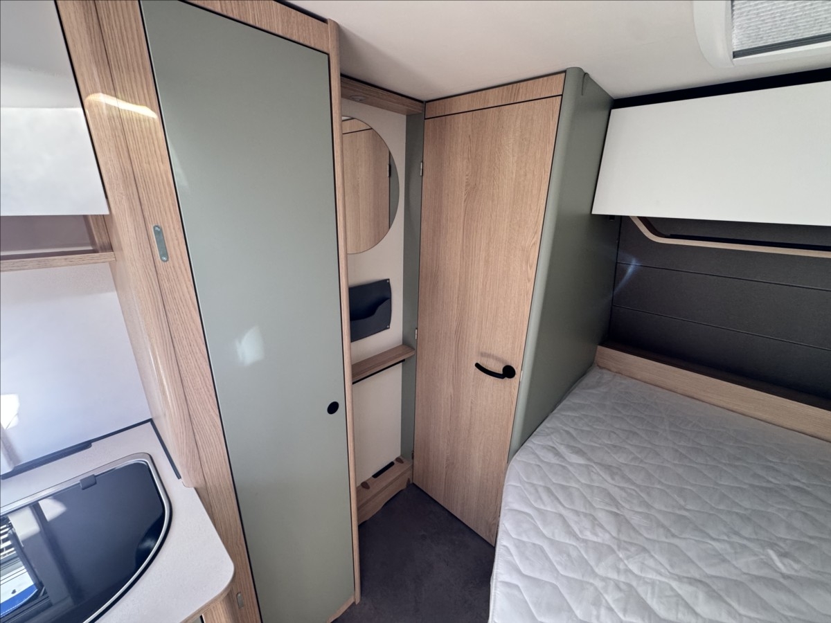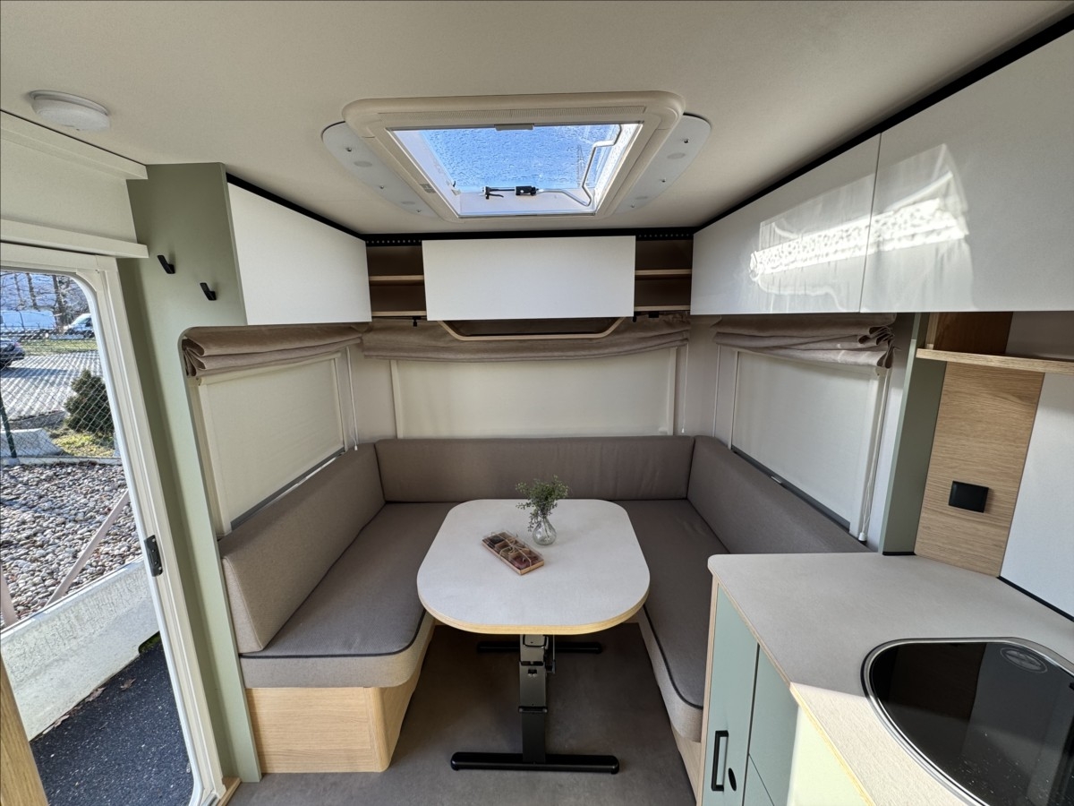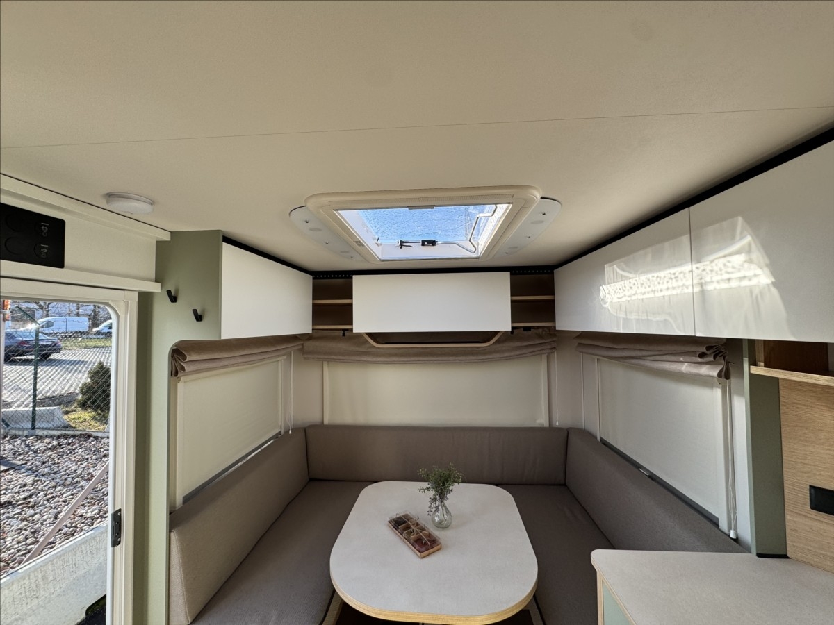 Leasing možný, Možné financování vozidla., Zadní francouzské lůžko, sezení rozložitelné na dvoulůžko, lednice s mrazákem, 12V automatická recirkulace vzduchu, 95AH AGM baterie, Nabíječka, Indikátor napětí baterie, 12V hlavní vypínač, Sprchová baterie, Sprchový závěs s tyčí, Dřevěná rošt do sprchové vaničky, Sprchová vanička, příprava pro TV, 5litrový ohřívač vody (včetně směšovací baterie)Recirkulační systém pro plynové vytápěníVstupní dveře s oknem včetně zatemňovací rolety, včetně odpadkového koše25litrová nádrž na odpadní vodu, rolovacíIndikátor nádrže na čerstvou vodu2x USB zásuvky pro napájecí kolejnici, příprava pro klimatizaci, LED ambientní osvětlení, černá litá kola......Celková hmotnost:1500kg ...Provozní: 1113kg...SPANÍ PRO 4 OSOBY... KARAVAN SKLADEM