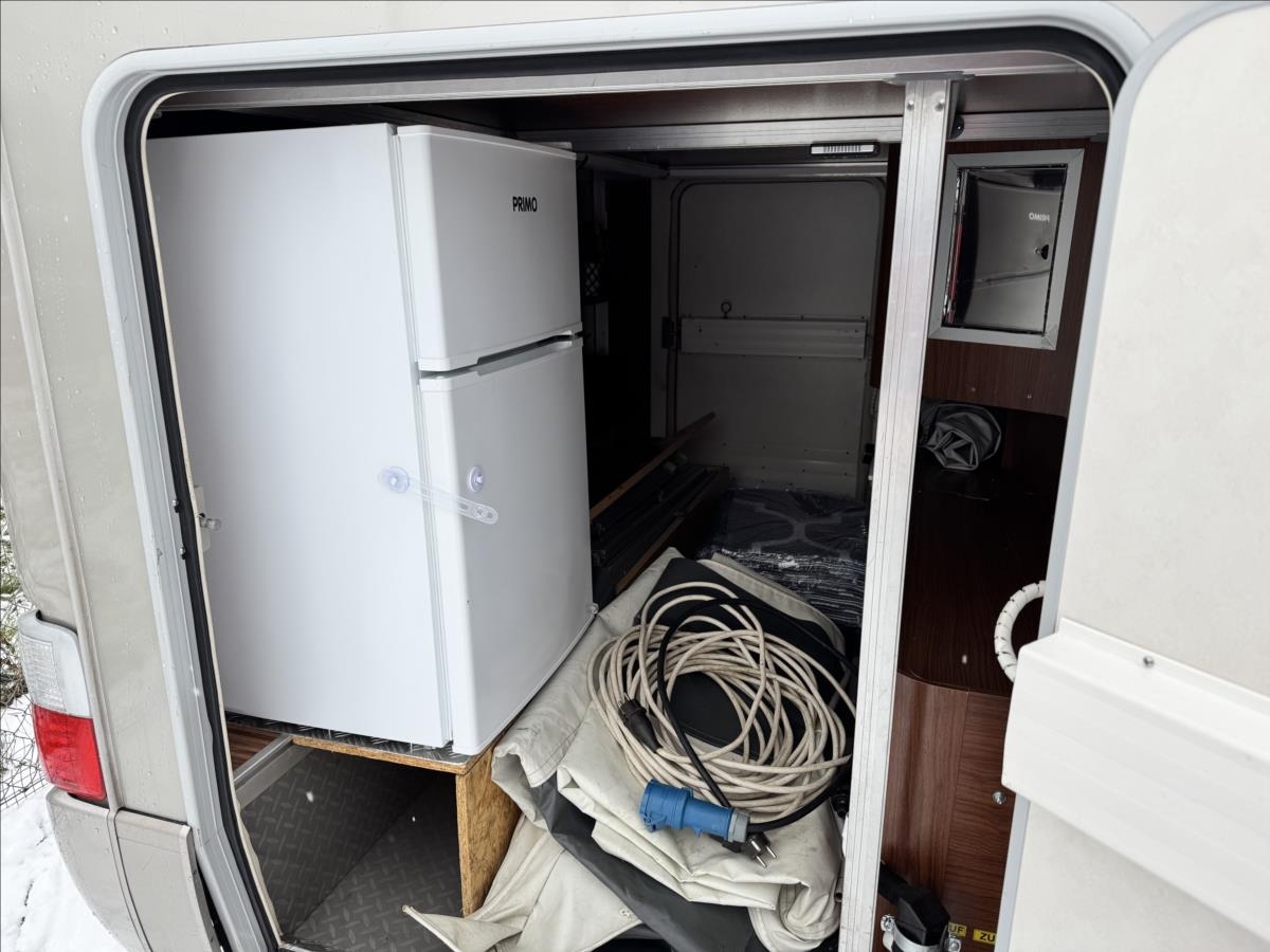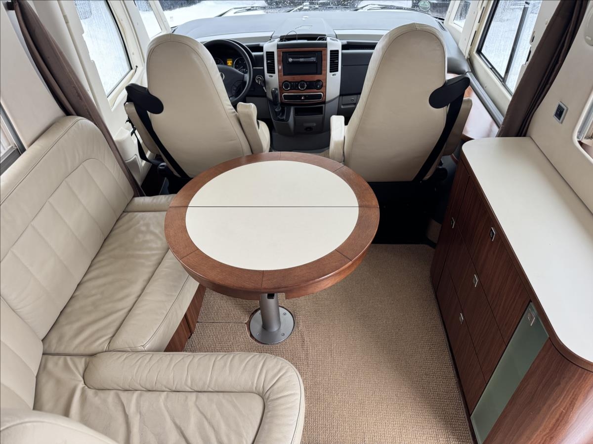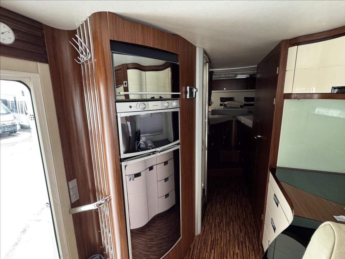 Zadní podélné postele s úpravou na jednolůžko + spouštěcí lůžko nad kabinou, lednice s mrazákem 12/230/plyn, plynová trouba, mikrovlnka, všechna okna se zatemněním a moskytiérou, hydraulické vyrovnávání vozu, měnič napětí, příprava pro tlakovou vodu, předstan, topení ALDE, elektrocentrála, přídavné bezpečnostní zámky, trezor, samostatné WC a kouupelna, automatický satelit + TV 12V, příprava pro pračku, druhá lednice v garáži, duocontrol, nástavbová klimatizace Truma... Celková hmotnost 5000kg, provozní 4560kg ... Celková délka: 863cm, výška: 288cm a šířka: 235cm... Spaní i jízda pro 4 osoby