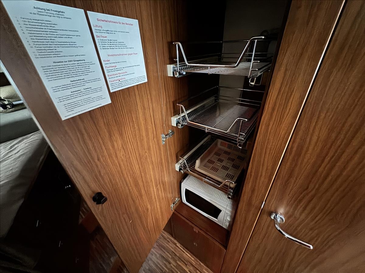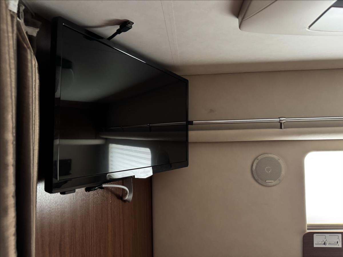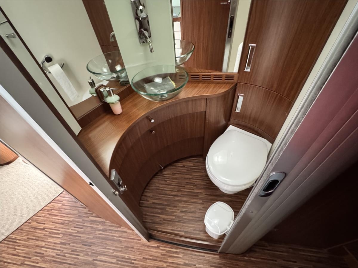 Zadní podélné postele s úpravou na jednolůžko + spouštěcí lůžko nad kabinou, lednice s mrazákem 12/230/plyn, plynová trouba, mikrovlnka, všechna okna se zatemněním a moskytiérou, hydraulické vyrovnávání vozu, měnič napětí, příprava pro tlakovou vodu, předstan, topení ALDE, elektrocentrála, přídavné bezpečnostní zámky, trezor, samostatné WC a kouupelna, automatický satelit + TV 12V, příprava pro pračku, druhá lednice v garáži, duocontrol, nástavbová klimatizace Truma... Celková hmotnost 5000kg, provozní 4560kg ... Celková délka: 863cm, výška: 288cm a šířka: 235cm... Spaní i jízda pro 4 osoby